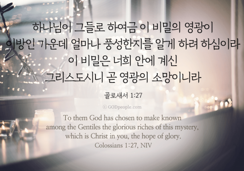 오늘도 제 안에 계신 그리스도로 인해 소망을 잃지 않게 하시니 감사합니다. 이 세상이 이해할 수 없는 비밀의 영광을 마음에 품게 하시고, 그 소망으로 살아가게 하시니 감사를 드립니다. 우리의 연약함 속에도 영광의 주님이 함께하시니, 내일을 두려워하지 않고 믿음으로 걸어가게 하소서.